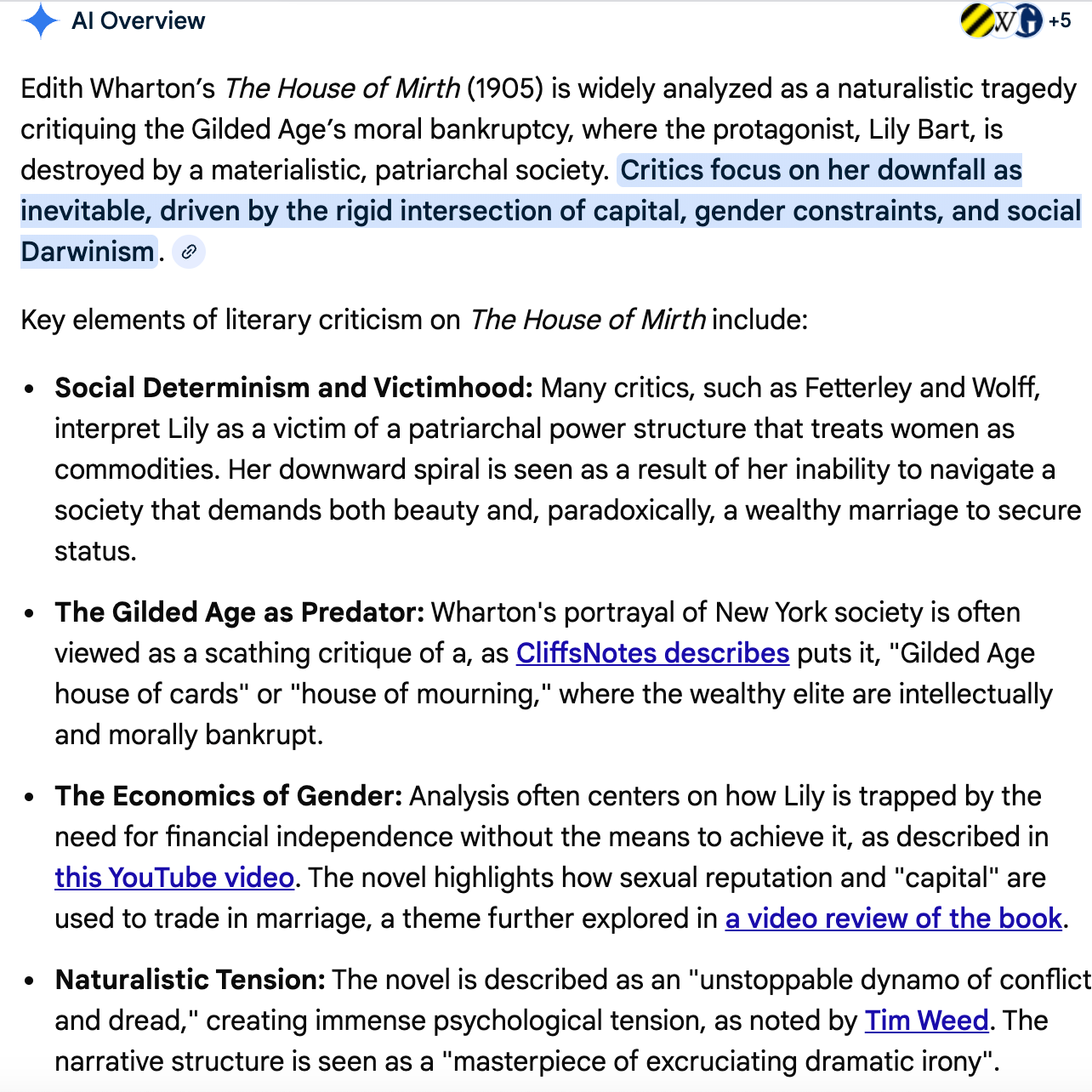 This is in part because I know AI research isn’t very good—it’s superficial at best, full of mistakes and hallucinations. It devalues something I deeply respect: the advent of AI has made the important work of real research all the harder. I constantly hear of incorrect AI research making its way into the student work seen by my academic clients and friends, and I worry about the rising generation of students thinking an AI search is research. I’ve also encountered its sloppiness personally. Next week, I am making the book tour appearance I am most excited about: I’m doing a drop-in visit to my partner’s “Nineteenth-Century American Fiction” class to discuss publishing careers and also, the ending of House of Mirth. (!!!) We timed my visit so I could discuss one of my all-time favorite books, one I first read when I was exactly these students’ age. To prep for the class, I wanted to refresh myself on the latest academic discourse on the novel. Let’s look at the AI results for “HOUSE OF MIRTH literary criticism.”